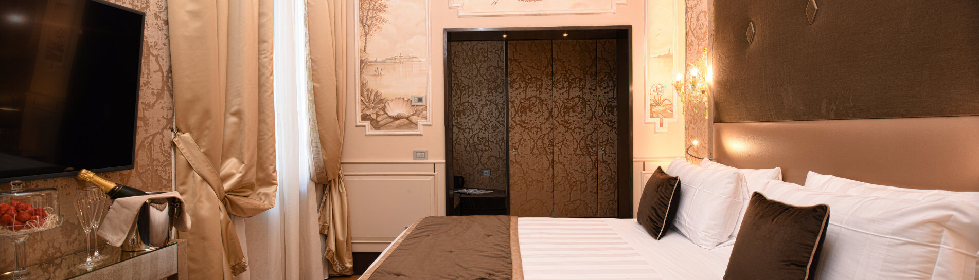 The Santa Croce Hotel has drawn inspiration from this utterly Venetian theme through the use of an ornamental, exotic floral decorative scheme that covers the walls and ceilings of the rooms, with a view to taking our guests on a journey of discovery of those green spaces, offering you a relaxing and peaceful way to immerse yourself in them.